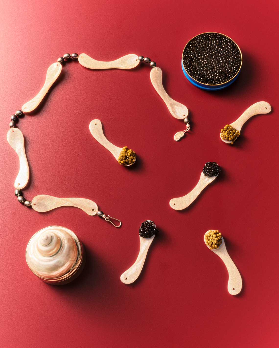 You never know when the caviar will appear, which is why we've partnered with Gohar World, a family-run atelier of charmingly unconventional tableware, to craft a provocative Pearl Spoon Necklace for any event or holiday soirée. Five mother-of-pearl spoons form an elegant ring, but the magic lies in the sixth. This hangs delicately in anticipation and can be easily detached to provide a personal utensil, should your caviar dreams suddenly and unexpectedly come true.